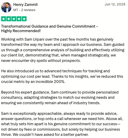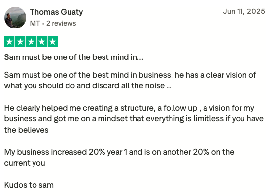 Since learning Sam’s systems, I’ve managed to stop travelling for work and instead generate my leads online. Excited to keep learning and growing.